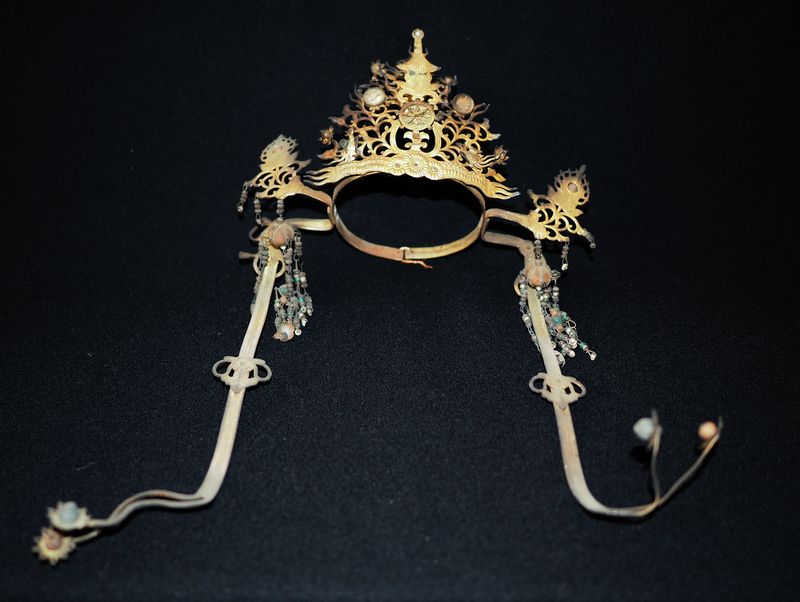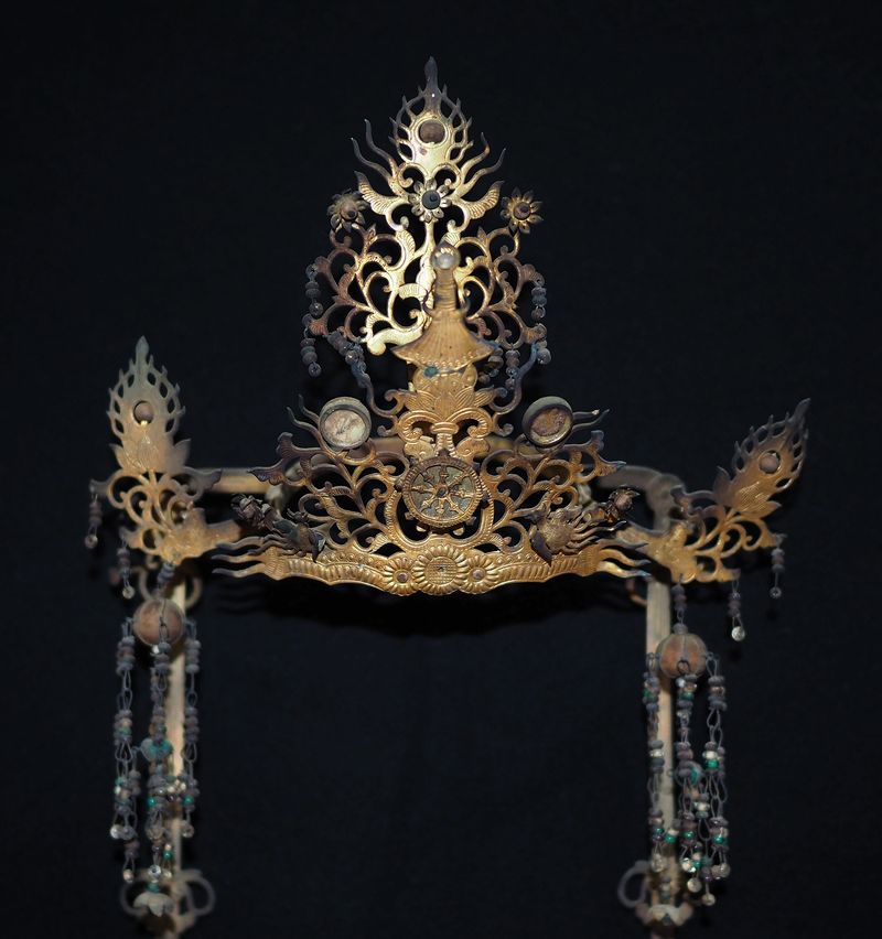 金銅板を透彫りにして数々の装飾を取り付けた宝冠です。