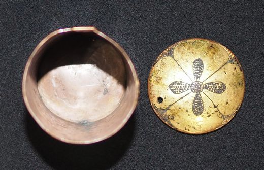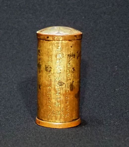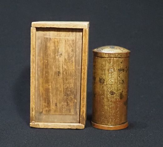 ご案内の金銅円筒形の経筒は、正面に梵字と納経の趣意の刻字、蓋に木瓜文に似た文様が刻まれ、全体は良質な鍍金で覆われています。