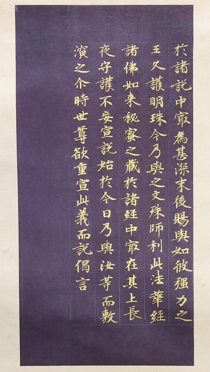 紫紙に銀界、金字で書かれた法華経の断簡五行です。