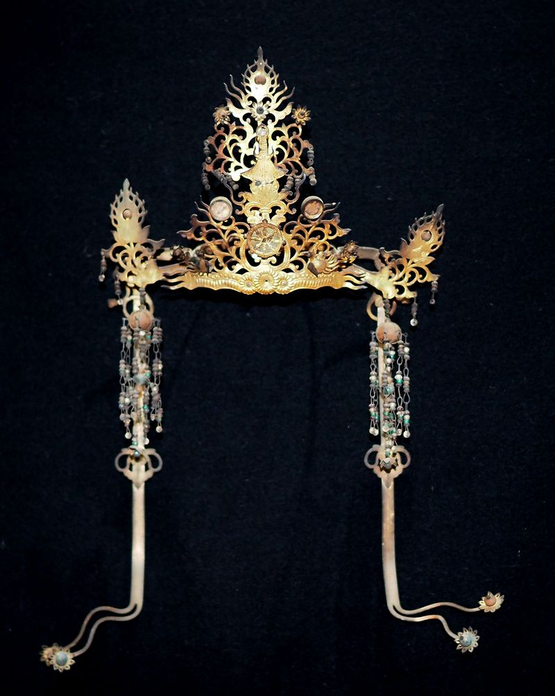 金銅板を透彫りにして数々の装飾を取り付けた宝冠です。