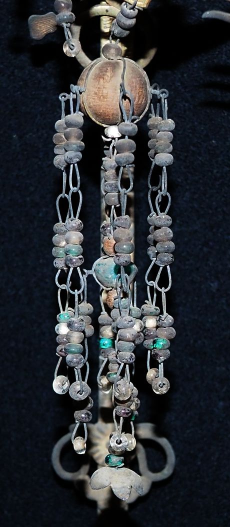 宝塔、輪宝、一対の鳥や宝珠の意匠の装飾には繊細な毛彫りの彫金が施され、多用されたガラスビーズは200個余りを数えます。