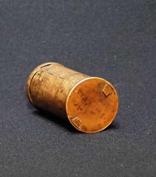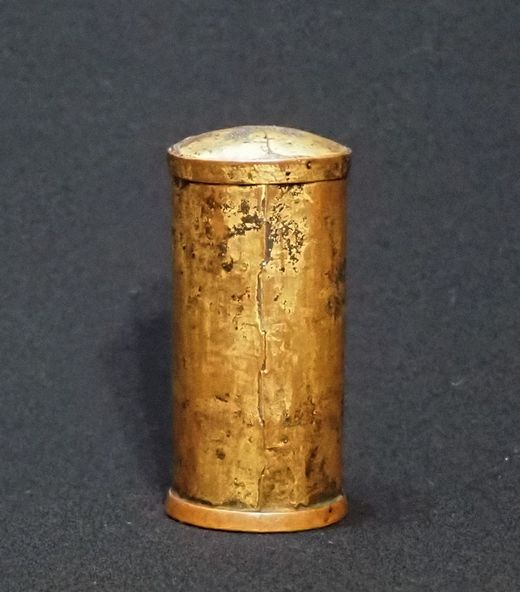 ご案内の金銅円筒形の経筒は、正面に梵字と納経の趣意の刻字、蓋に木瓜文に似た文様が刻まれ、全体は良質な鍍金で覆われています。